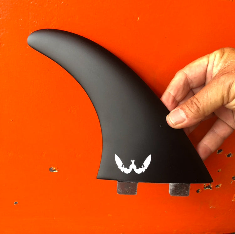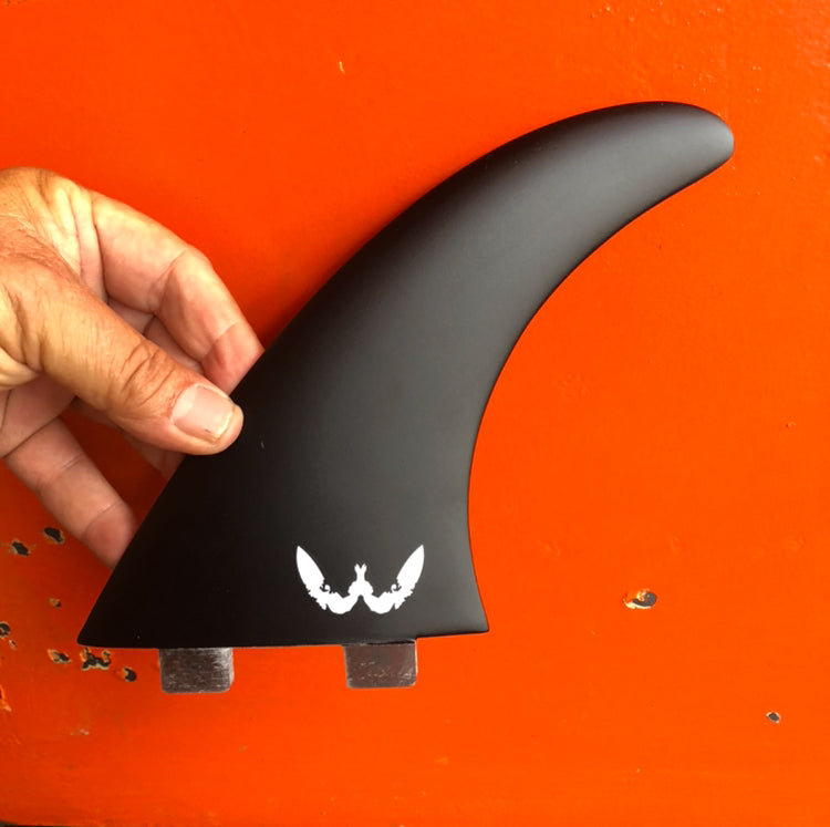 The transformers Tri-fin set has the same size front fins as the quad set but has a flexing keel in the rear plug. The flexing keel has only one tab at the front of the fcs option and has a clean cut line under the fin for futures. As a result the fin can both pivot and flex a little to match with the line that the front fins are taking, even in tight turns. It makes for a smooth extension out of turns and adds a level of stability and control.